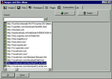 L’album immagini e file interno. Si può modificare, cercare, sostituire, cancellare qualsiasi oggetto presente nell’ipertesto, come immagini, collegamenti a indirizzi Internet, pagine e altro ancora. Per esempio quando cambi un collegamento Internet qui, il cambiamento si propaga a tutto l’ipertesto!